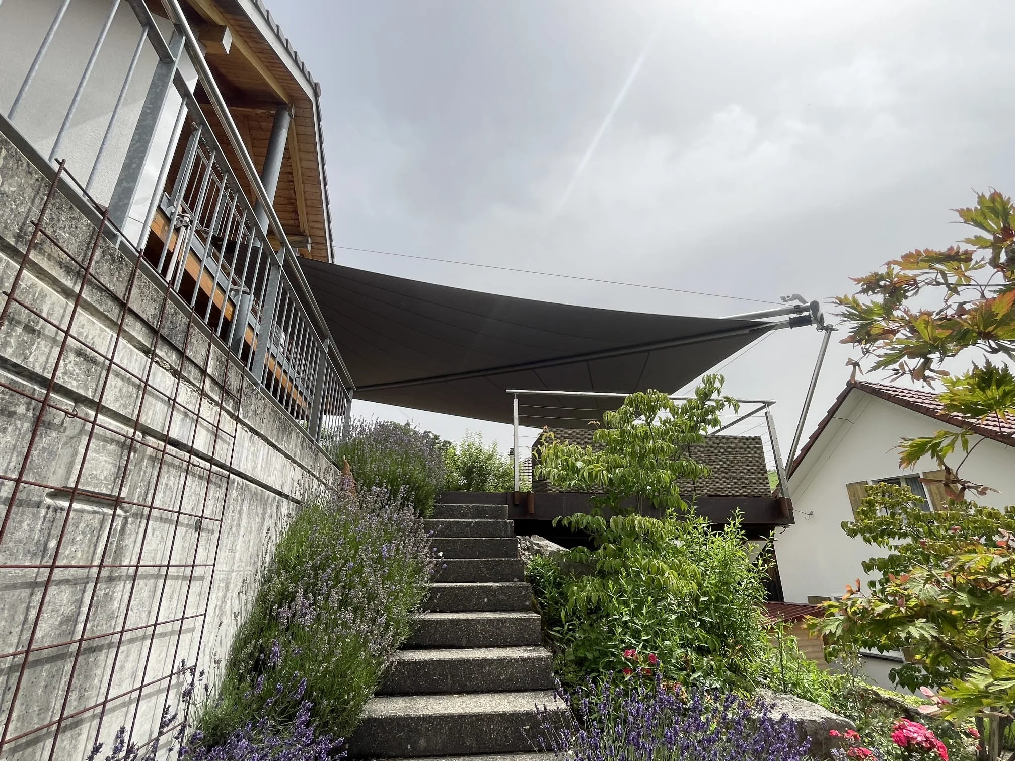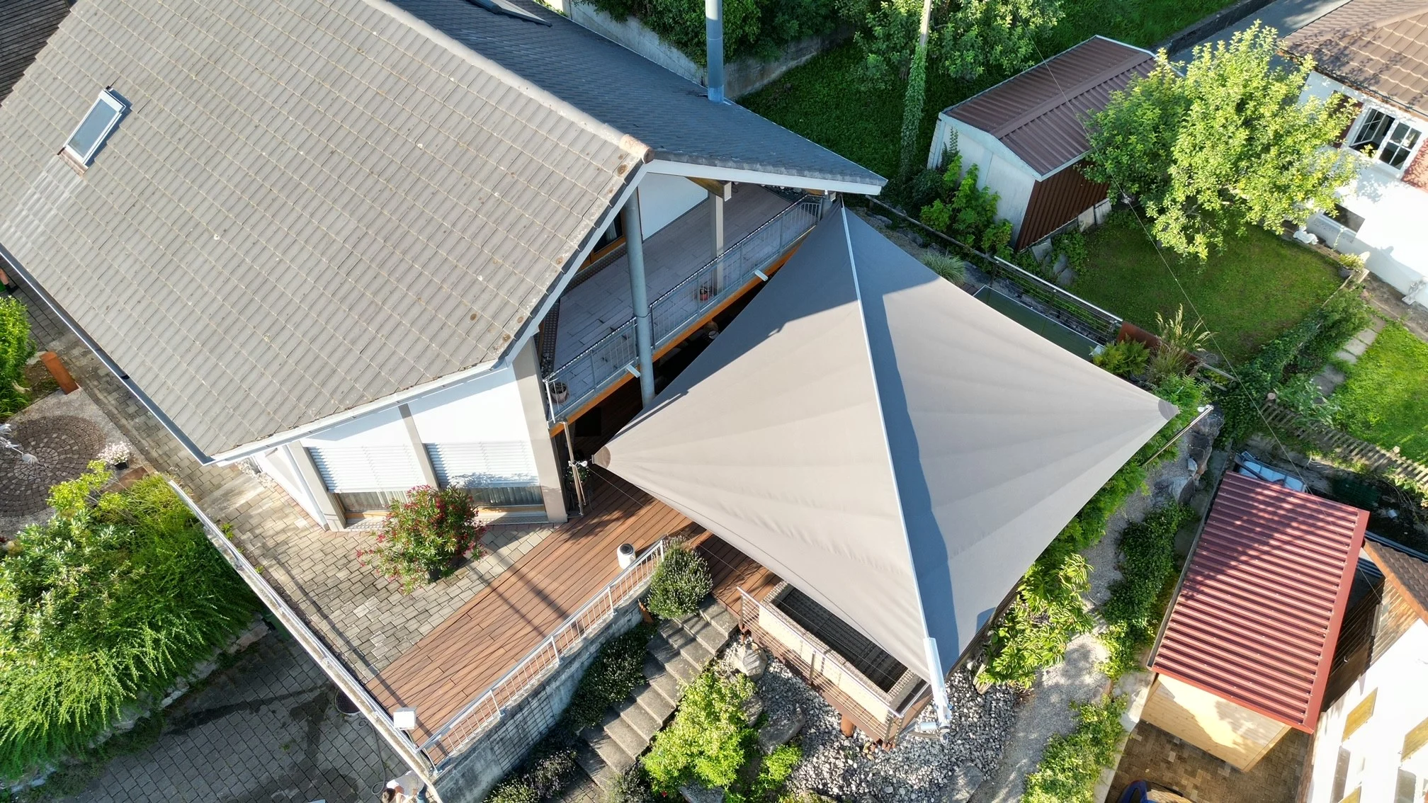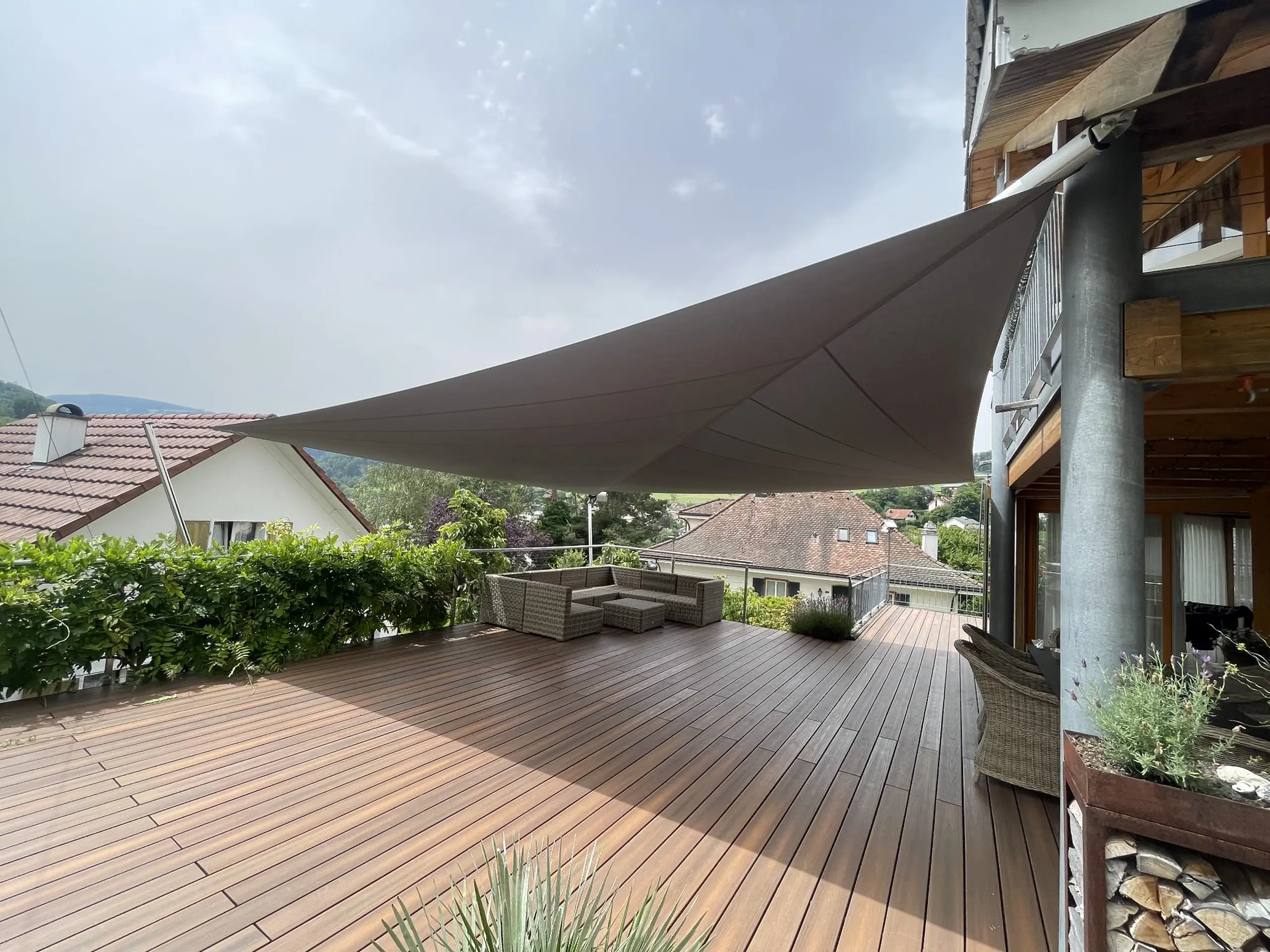 Ein wunderschönes Holzdeck mit viel Potenzial, das im Sommer zur Hitzefläche wurde. Die starke Sonne heizte das Holz so schnell auf, dass die Terrasse kaum geniessbar war. Gewünscht war eine filigrane, leichte Lösung, die sofort vor Überhitzung schützt und zugleich die steile Abendsonne zuverlässig abfängt. Schritt für Schritt entstand gemeinsam mit der Bauherrschaft ein massgefertigtes Sonnensegel, das sich harmonisch in die Architektur einfügt und den Aussenbereich wieder zum Lieblingsplatz macht. Heute geniessen die Eigentümer ihre Terrasse in vollen Zügen und beim ersten Sommerfest gab es begeistertes Feedback von Familie und Freunden.