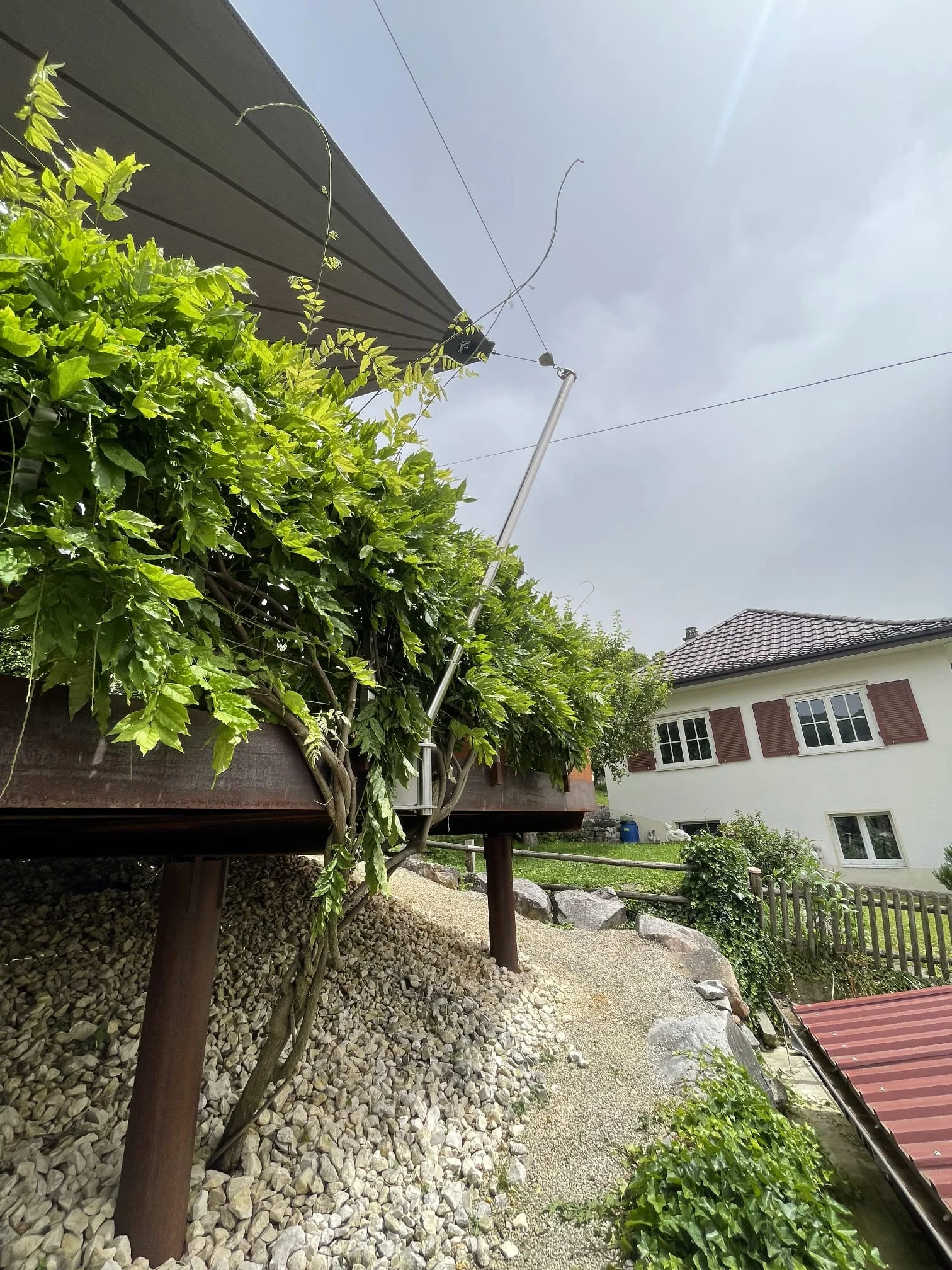 Die Anlage umfasst 45 Quadratmeter und wurde komplett in 3D geplant, inklusive Schattensimulation für maximale Planungssicherheit. Wir waren zweimal vor Ort, um die Details sauber mit dem Bestand abzustimmen. Weil das Holzdeck auf einer Stahlkonstruktion steht und die Reben entlang der Fläche wachsen, haben wir eine massgeschneiderte Plattenhalterung umgesetzt, die präzise zwischen die Begrünung passt, ohne sie zu verletzen. Aus der Simulation ergab sich zusätzlich eine Höhenverstellung, damit auch in den späten Abendstunden zuverlässig Schatten dort entsteht, wo er gebraucht wird.